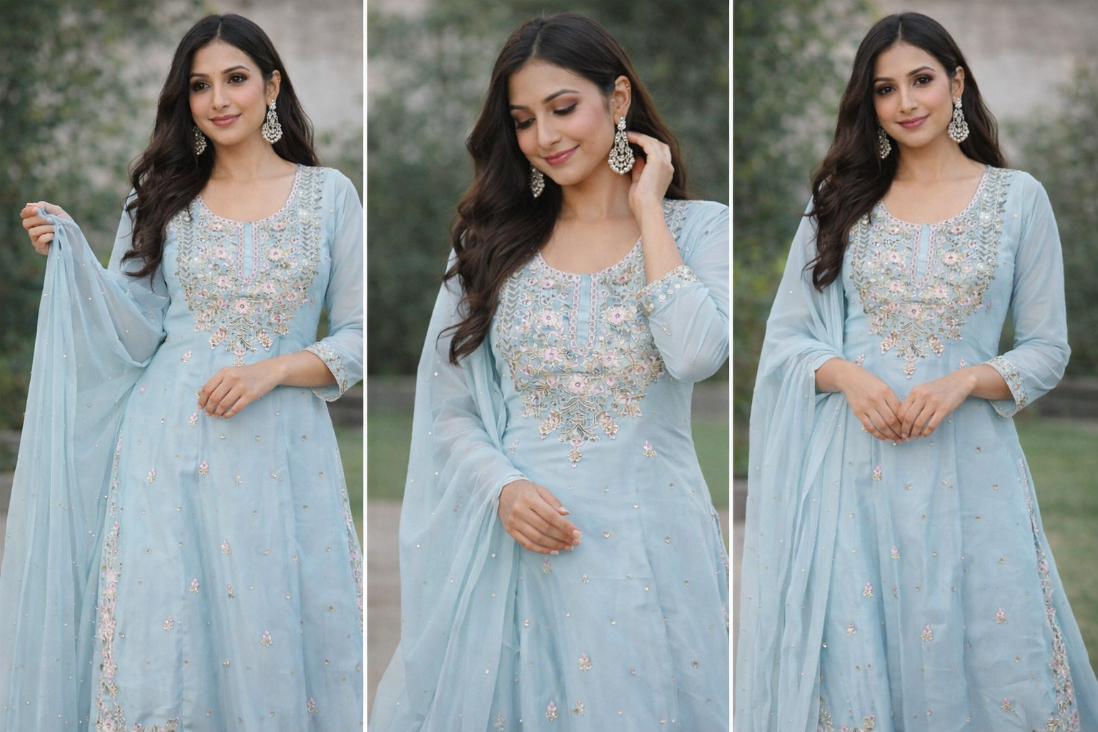 Paired with a matching flowy palazzo that ensures comfort and ease of movement, the set is completed with a soft, lightweight dupatta adorned with delicate embellishments for a refined finish. The soothing pastel blue shade adds a fresh and classy touch, making this outfit ideal for weddings, festivals, parties, and special celebrations.