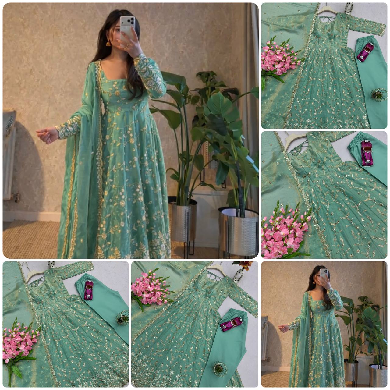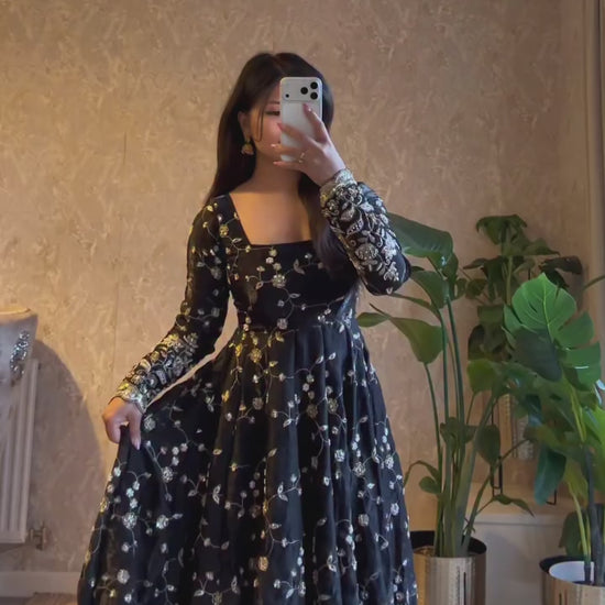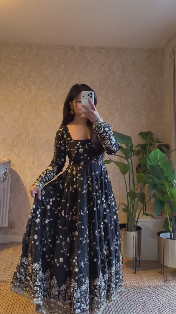 Elevate your festive and partywear wardrobe with this elegant embroidered gown set, crafted from premium heavy Fandy silk fabric. The gown features exquisite thread embroidery with sequin work, giving it a rich and graceful appeal. Fully stitched for a perfect fit and paired with a soft micro cotton inner, this outfit ensures both comfort and style.