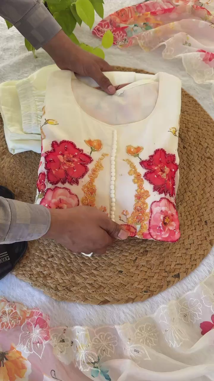 👗Gown Fabrics Fox Georgette Heavy Quality Fabric With Handwork Neck And Sleeve ,Full Long With Crepe Pant , Taby Silk Digital print Dupatta With Embroidery Sequence Work Broder