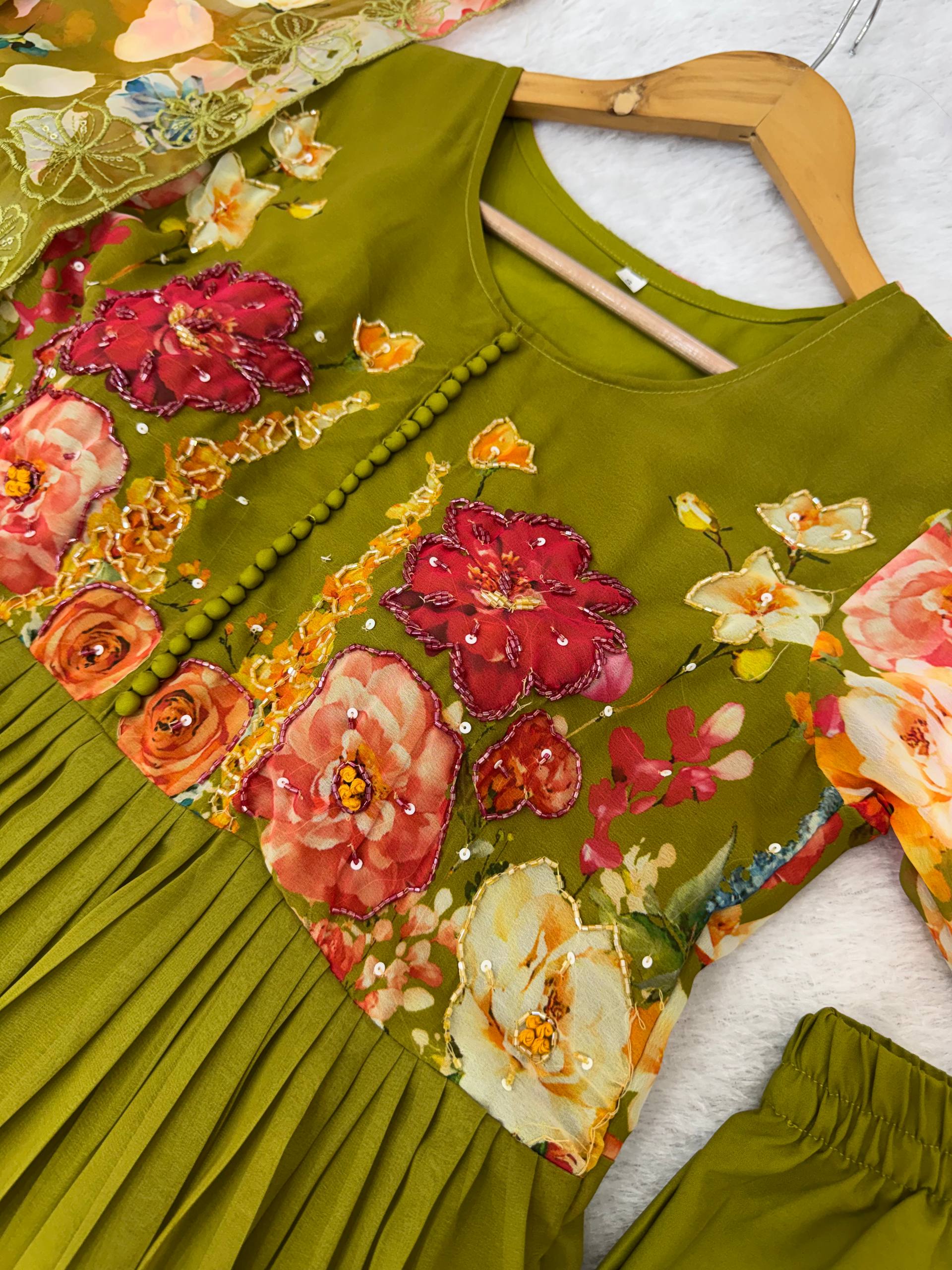 👗Gown Fabrics Fox Georgette Heavy Quality Fabric With Handwork Neck And Sleeve ,Full Long With Crepe Pant , Taby Silk Digital print Dupatta With Embroidery Sequence Work Broder