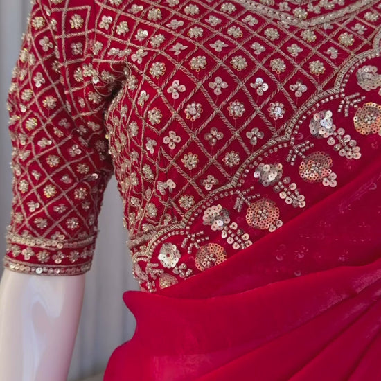 Enhance your ethnic wardrobe with this stunning Designer Saree, beautifully crafted with heavy beads work, intricate embroidery, and sequin detailing. The rich bead embellishments on the border, pallu, and blouse add a luxurious shimmer, making this saree perfect for grand occasions.
