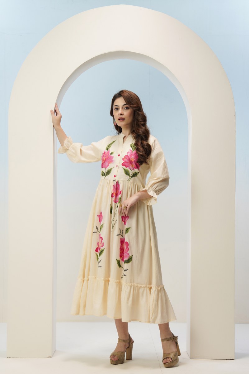 The elegant hand-painted floral design gives each piece a unique handcrafted appeal, blending traditional artistry with modern silhouettes. Its flowy structure and lightweight texture make it ideal for casual outings, brunch dates, vacations, and everyday wear.
